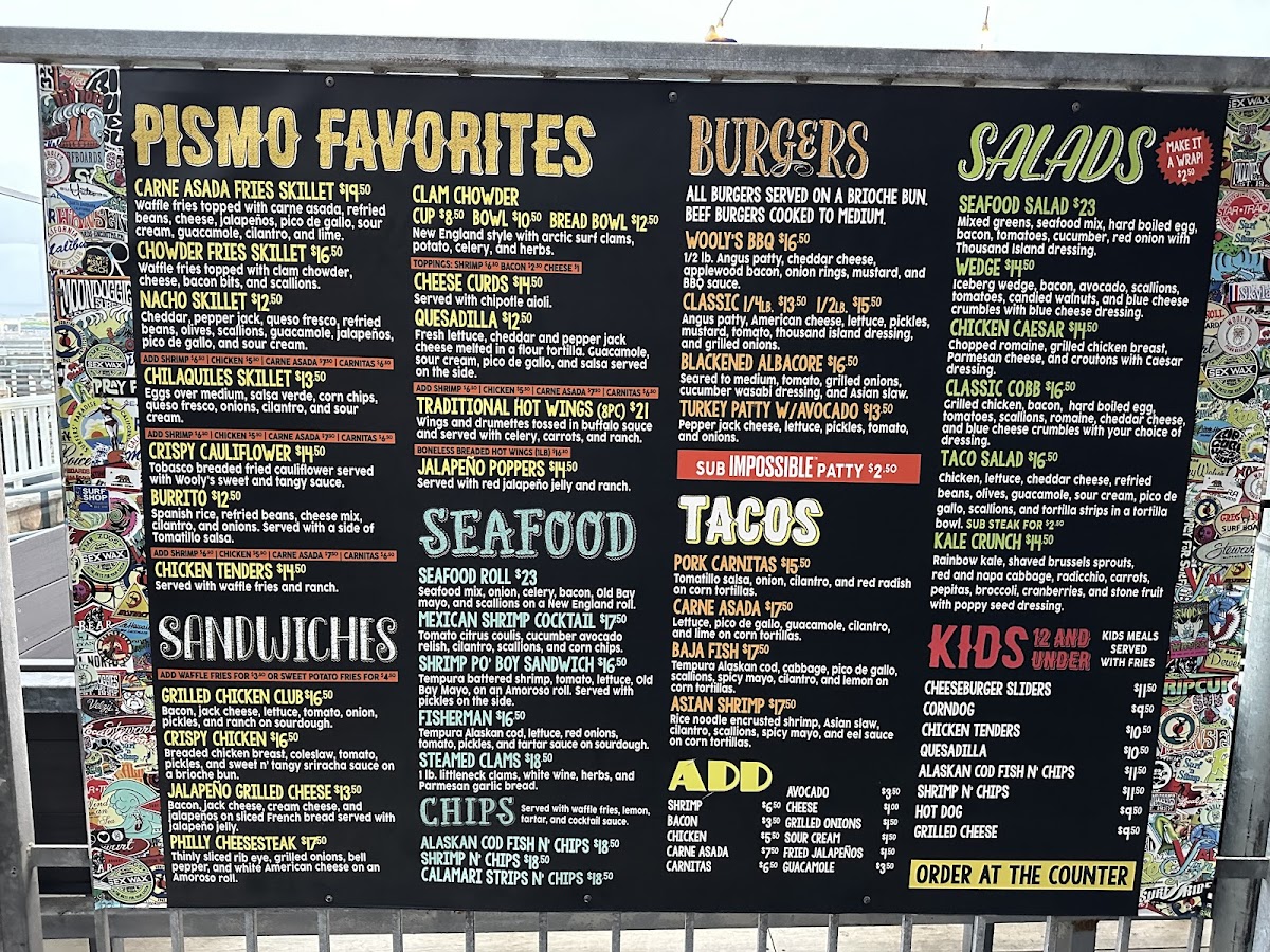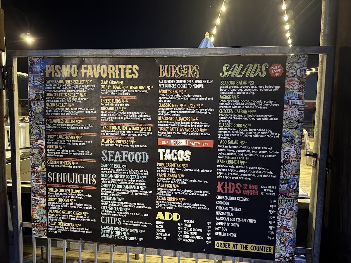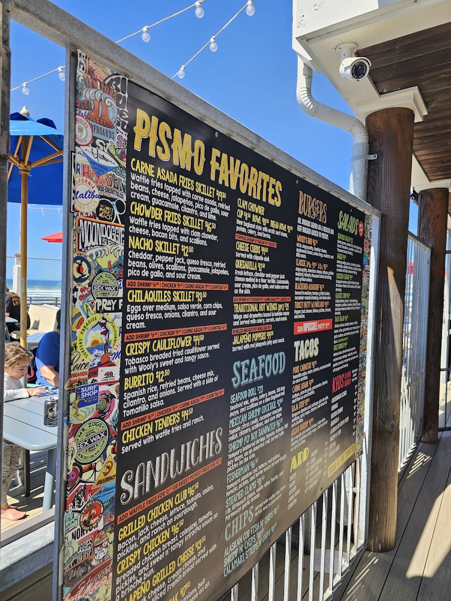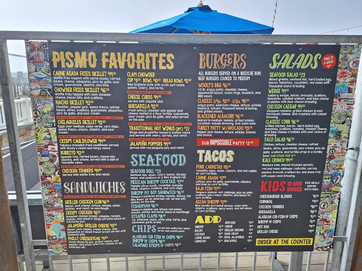 Introducing the menu at Wooly's, a charming bar and grill nestled by the picturesque Pismo Beach, offers an exciting culinary journey that celebrates fresh seafood and vibrant flavors. The menu shines with highlights like the Baja Fish Tacos, featuring tempura cod and a zesty spicy mayo, delivering an explosion of taste in every bite. The Asian Shrimp Tacos add a delightful twist with their rice noodle-crusted shrimp, layered with a refreshing Asian slaw. Not to be missed, the Steamed Clams are prepared with white wine and fresh herbs, perfect for a beachside experience.