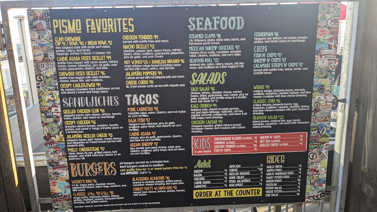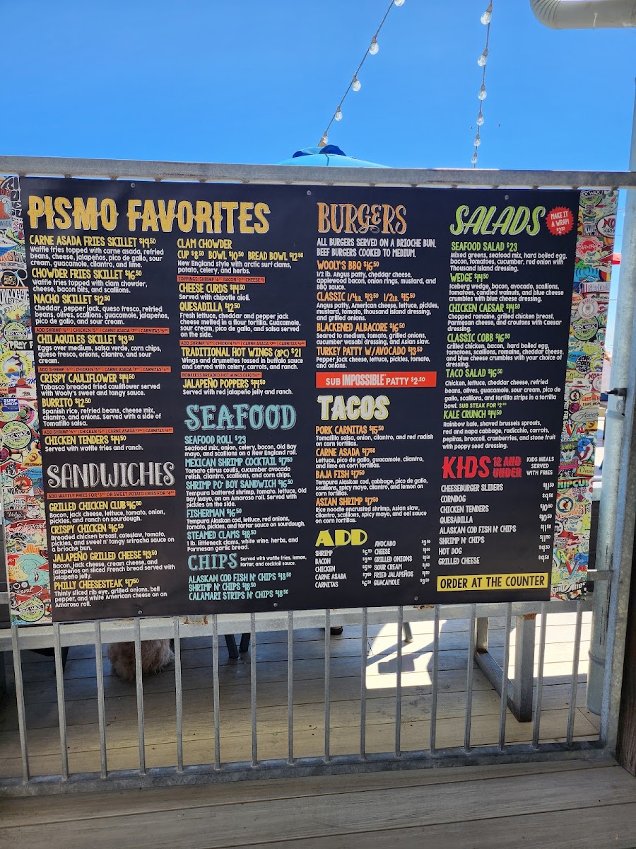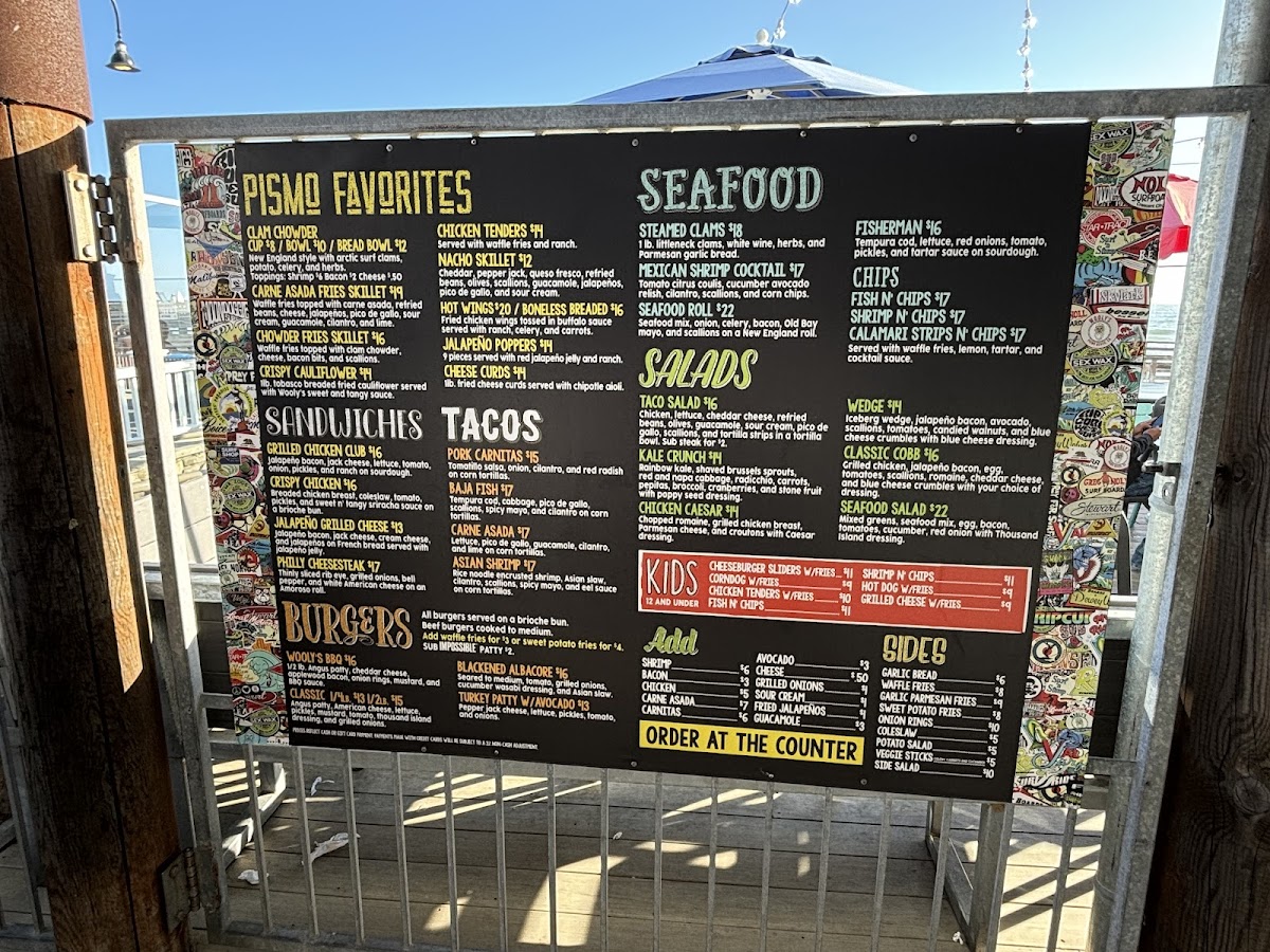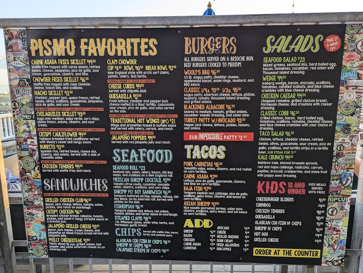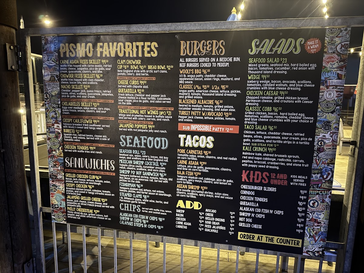 Introducing the menu at Wooly's, a charming bar and grill nestled by the picturesque Pismo Beach, offers an exciting culinary journey that celebrates fresh seafood and vibrant flavors. The menu shines with highlights like the Baja Fish Tacos, featuring tempura cod and a zesty spicy mayo, delivering an explosion of taste in every bite. The Asian Shrimp Tacos add a delightful twist with their rice noodle-crusted shrimp, layered with a refreshing Asian slaw. Not to be missed, the Steamed Clams are prepared with white wine and fresh herbs, perfect for a beachside experience.